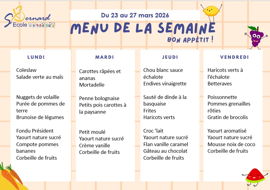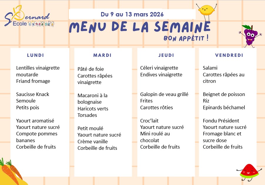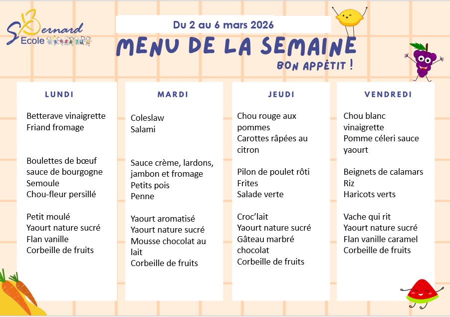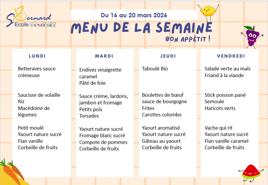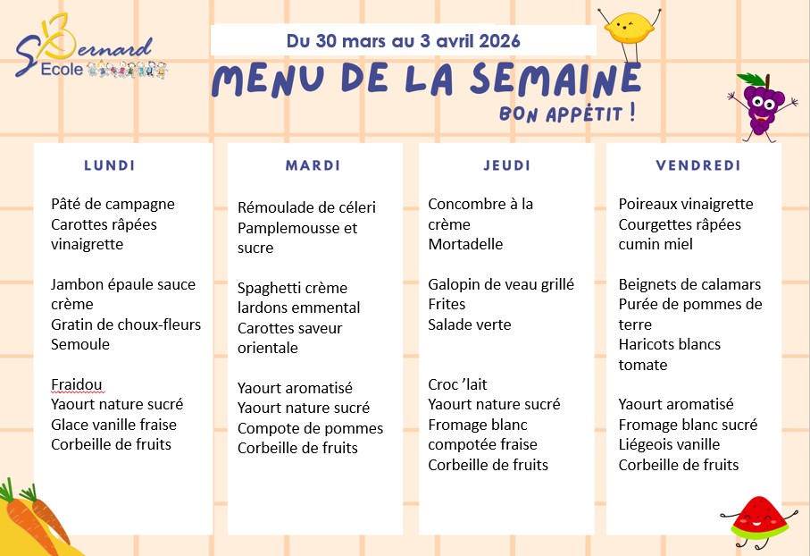 Cette semaine, la cantine de l'école Saint Bernard de Cambrai vous propose ...